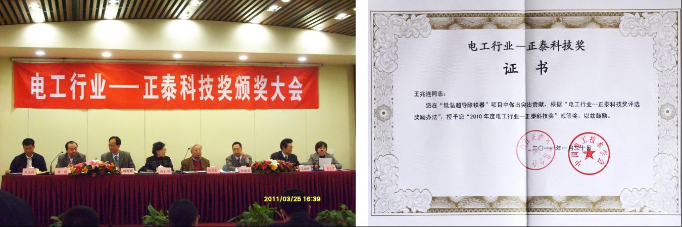 2011年3月25日,2010年度“電工行業——正泰科技獎”頒獎大會在北京中國科技會堂舉行。我公司董事長、總經理王兆連以其率領團隊在研發超導除鐵器上的貢獻獲此殊榮。