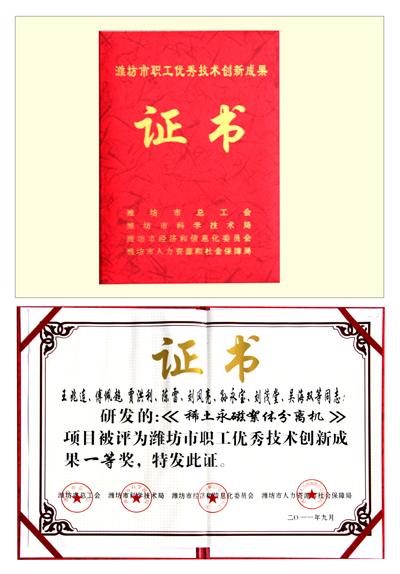 公司研發的稀土永磁絮體分離機項目被評為濰坊市職工優秀技術創新成果一等獎。