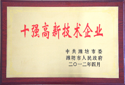 4月28日,在全市科技創新先進單位表彰大會上,公司被授予“2011年度濰坊市十強高新技術企業”。