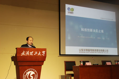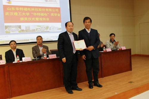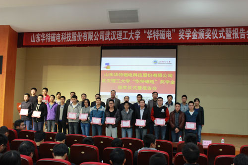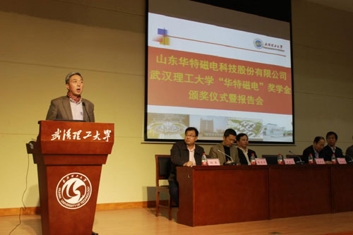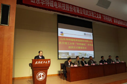 11月20日華特磁電董事長、總裁王兆連先生,公司常務副總裁劉風亮受邀赴武漢理工大學參加華特磁電獎學金頒獎儀式并分別作重要報告。校方高度重視,兩位院士及院校主要領導10余人熱情接待,并組織近四百名師生參加此次活動。