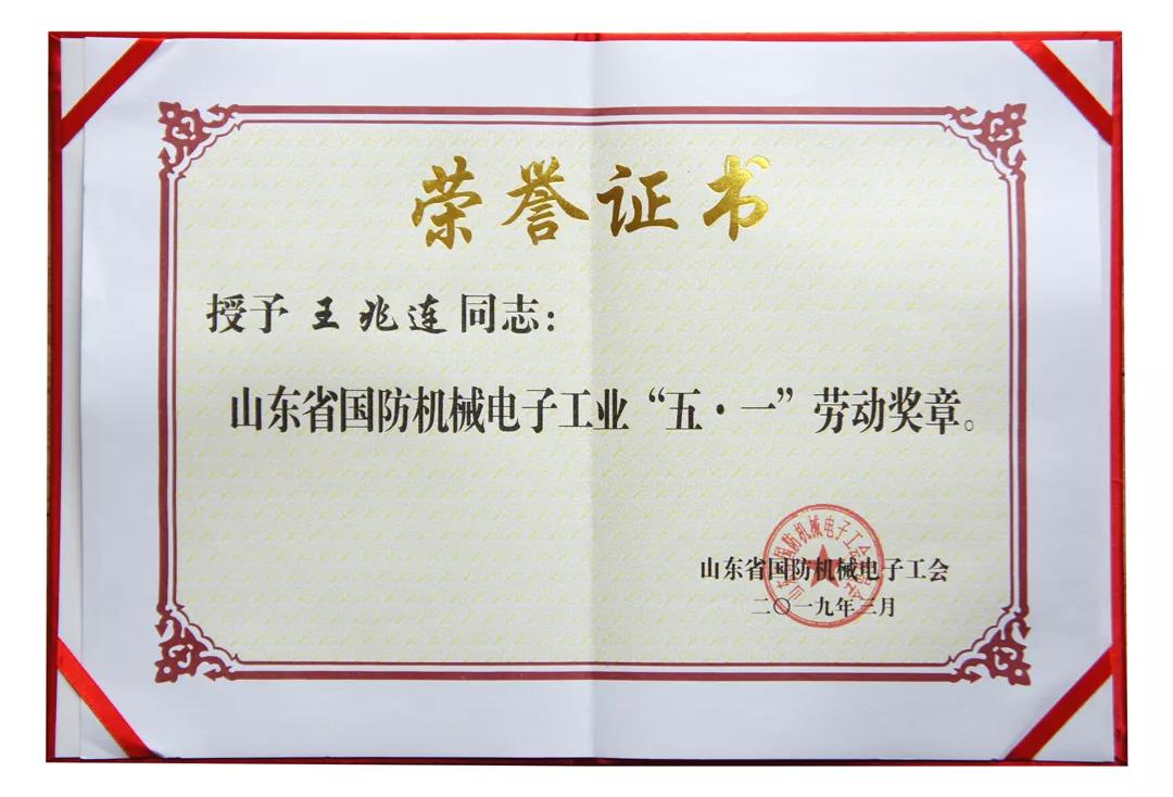 華特公司董事長王兆連榮獲2019年度山東省國防機械電子工會“五一勞動獎章”